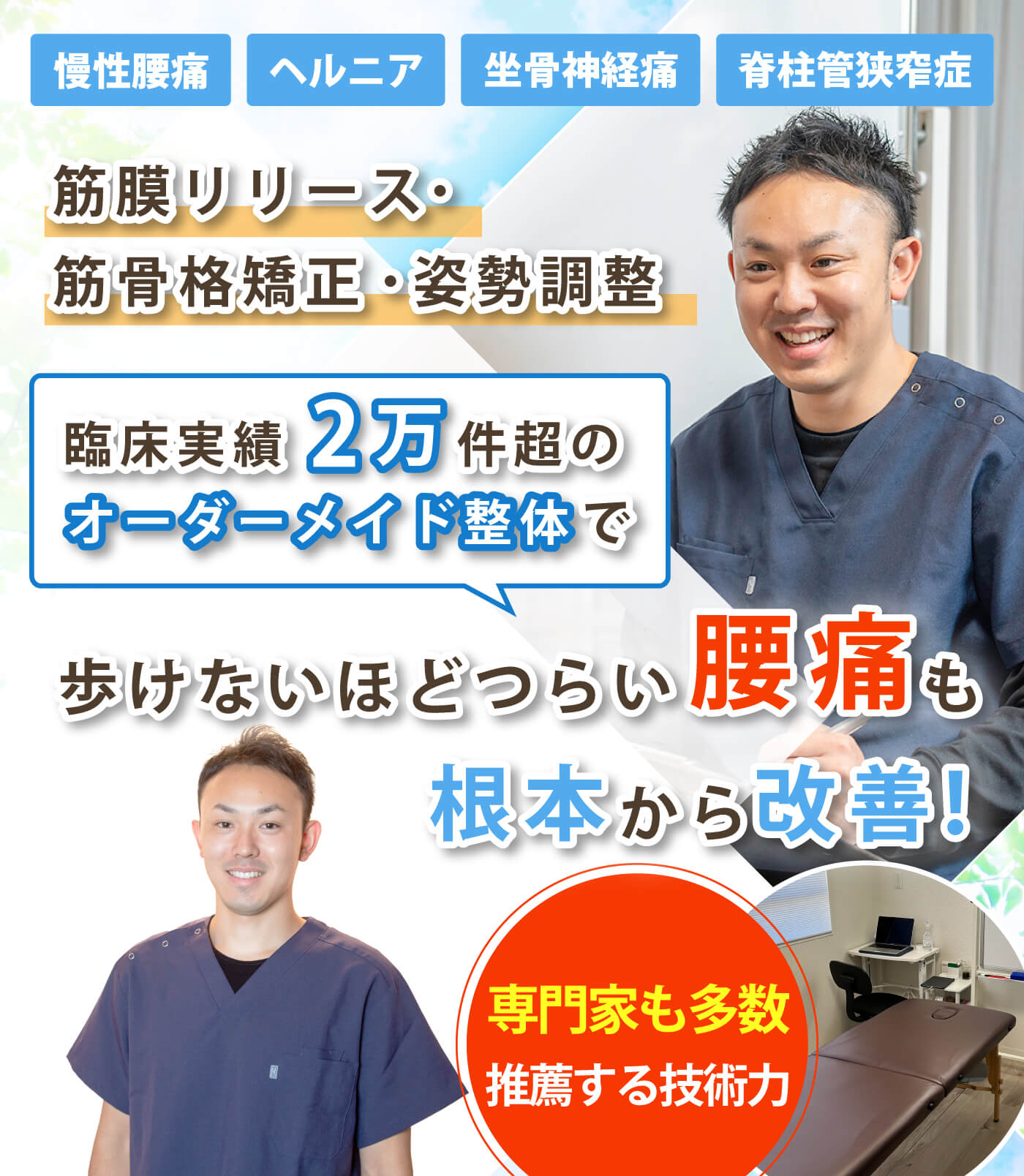 慢性的な腰痛、椎間板ヘルニア、ぎっくり腰、坐骨神経痛など腰痛の経験施術が豊富な整体院です。施術して終わりではなく、その後の自宅でできるセルフストレッチや生活習慣の指導もいたします。